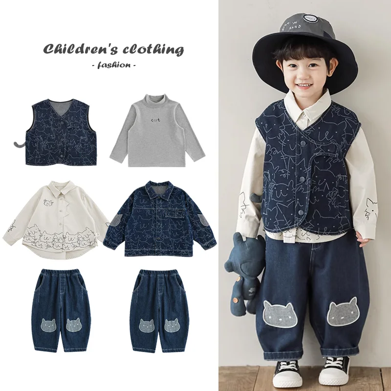 Baby Boy Clothes Denim Series Fashion Graffiti Kitten Print Boy Jacket Jeans Set Children's Vest Coat Korean Kids Clothes