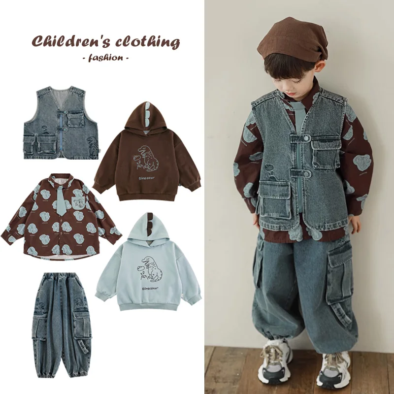 Retro Baby Boy Outfit Set Fashion Design Boys Cotton Shirt Vest Jeans Children's Hoodie Kids Boutique Clothes